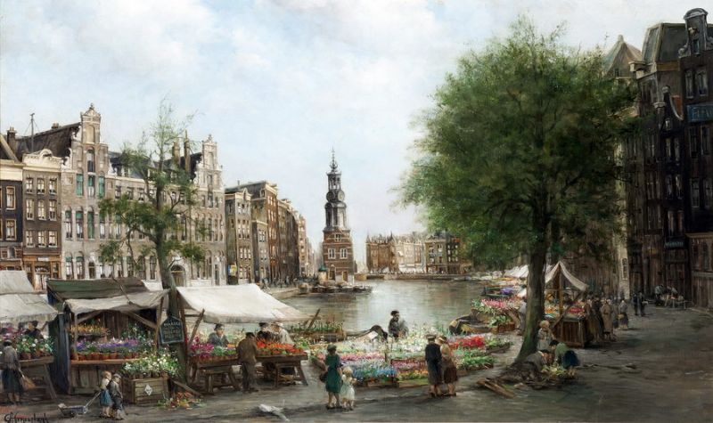 Gezicht op de Bloemenmarkt en de Munttoren, Amsterdam