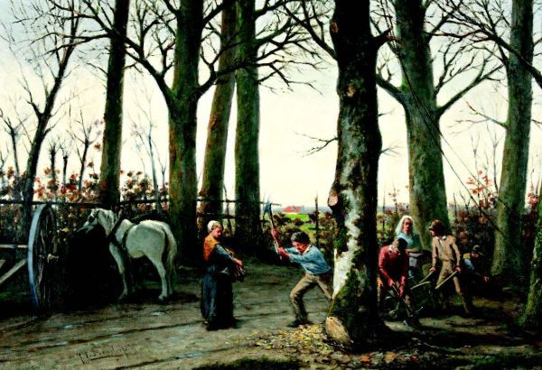 Houthakkers met paarden in het bos