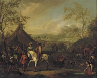 | An elegant company on horseback by a camp in a wooded landscape | |