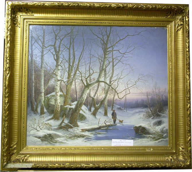 Vinterlandskap med jägare och hund