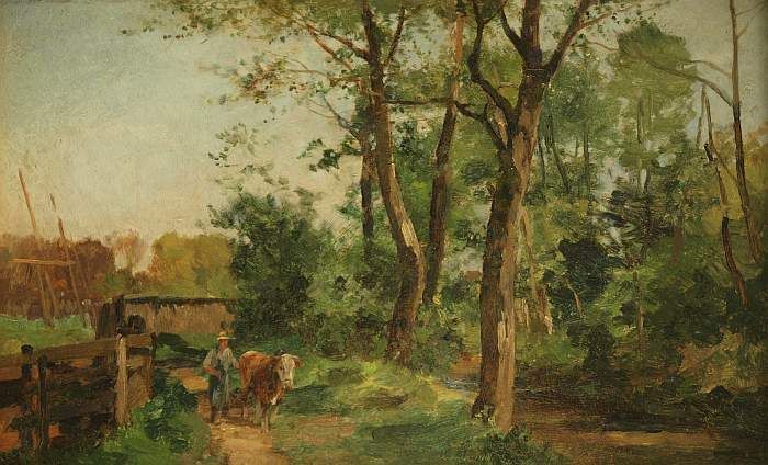 . Bauer mit Rind in ländlicher Idylle am Bachlauf