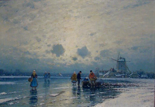 | ugefrorener holländischer Kanallauf mit Eisfischern, im Hindergrund Dorfsilhouette mit Windmühle | |