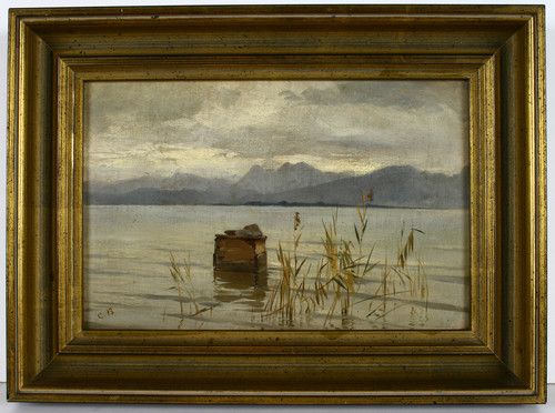 Blick vom schilfbestandenen Ufer eines Sees auf alpine Bergkette