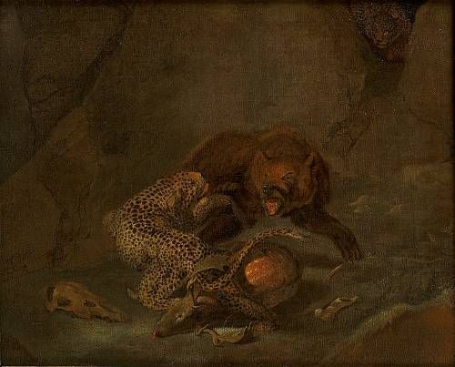 | A leopard with a dead deer and a bear in a rocky landscape, another leopard looking on | |