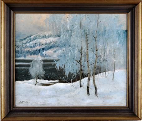 Uppfriskande vintermotiv med björkar mot vattendrag och skogsprydd höjd