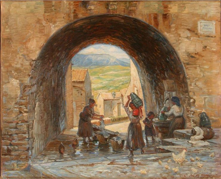 | Italian street scene with women by a fountain. | |