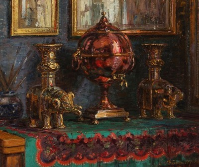 Still-life with a samovar and candle holders shaped like elephants