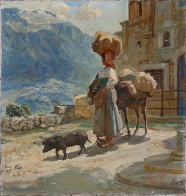 | View from Civitella Roveto with a woman and a donkey standing by a church | |