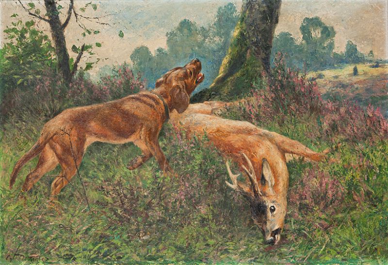Erfolgreiche Morgenpirsch. Jagdhund, einen toten Rehbock verbellend.