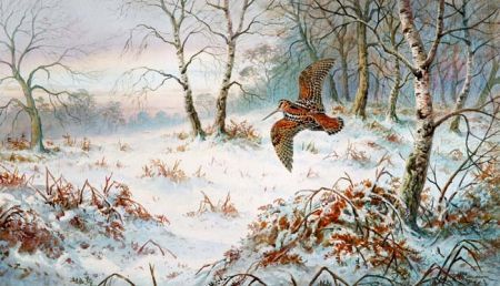 Woodcock in Flight, in a Wooded Snowy Landscape