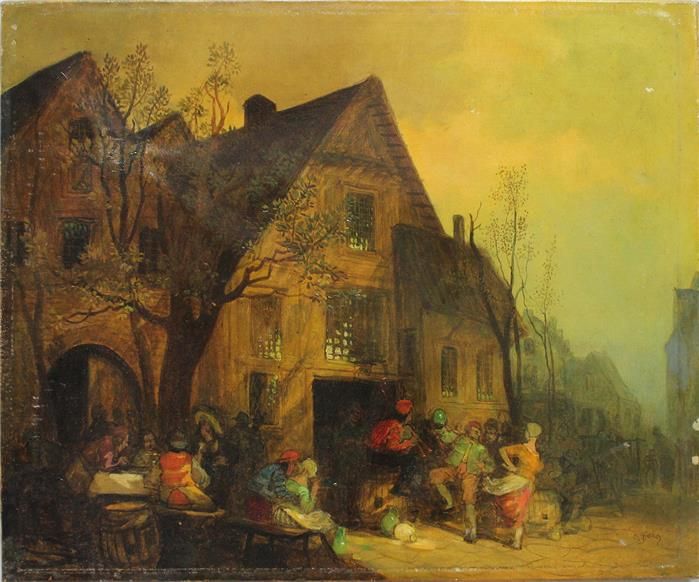 Straßenszene mit illustrer Gesellschaft vor einem Wirtshaus.