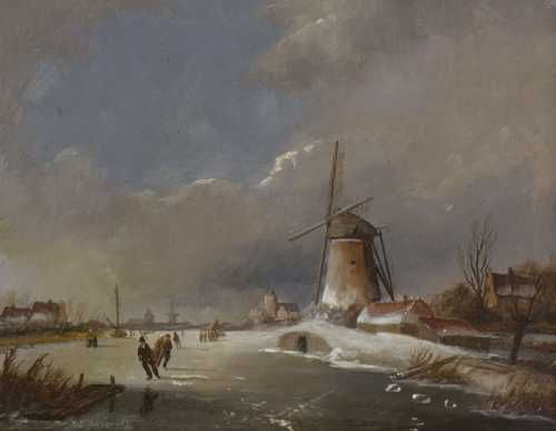 Schlittschuhläufer in holländischer Winterlandschaft.