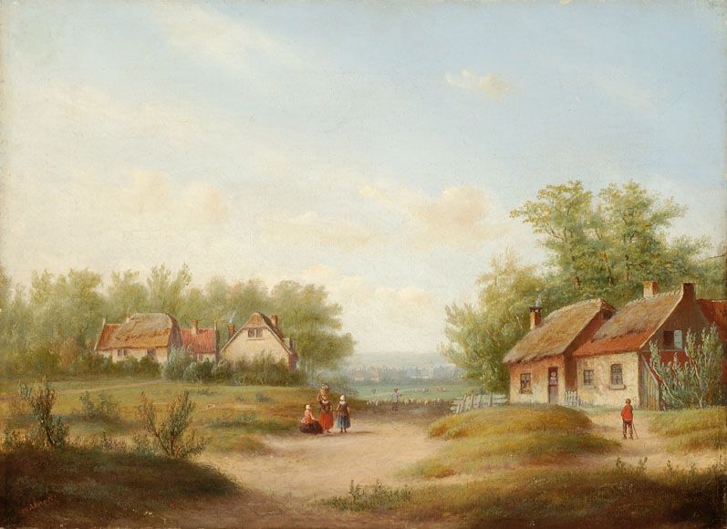| Talking figures and a shepherd with his flock on a dirttrack by houses in a landscape | |