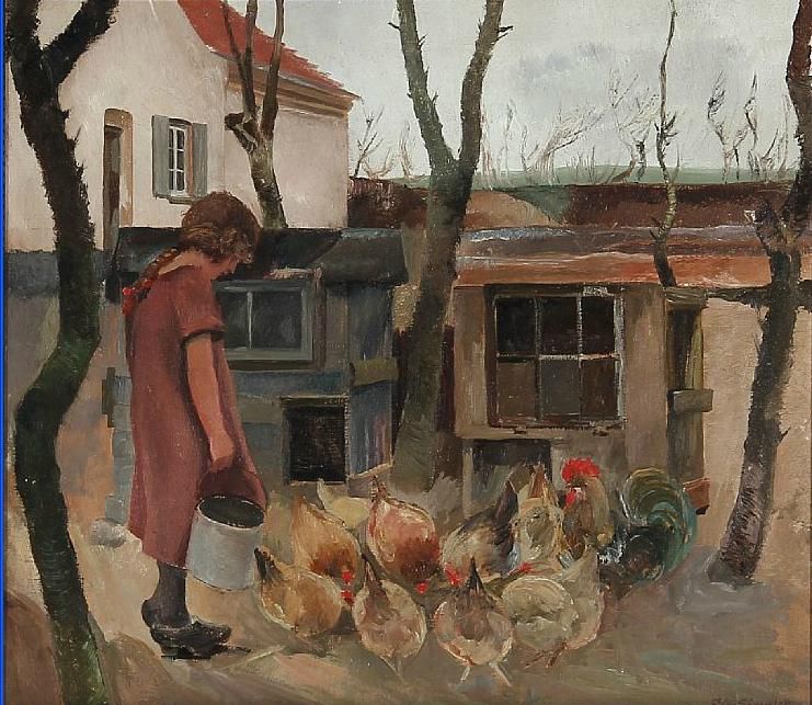 A girl feeding chickens.
