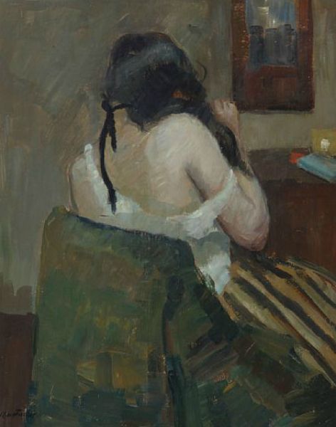 Interior with a backturned woman sitting on a chair