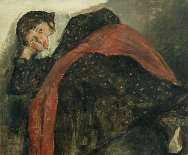 Reclining woman dressed in red and black