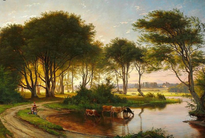 | Danish summer landscape with two girls watering the cows in a stream. In the background sunny fields and farms | |