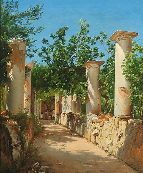 Italian ancient columns, in the background figures at the well