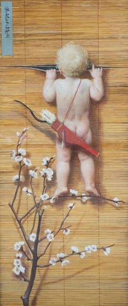A cupid peeping through a bamboo blind