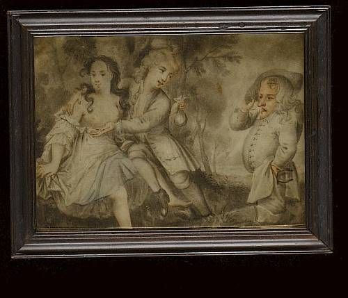 | Two lovers in a woodland glade, the man in frock coat and breeches, his right arm around the shoulders of the woman, caressing h | |