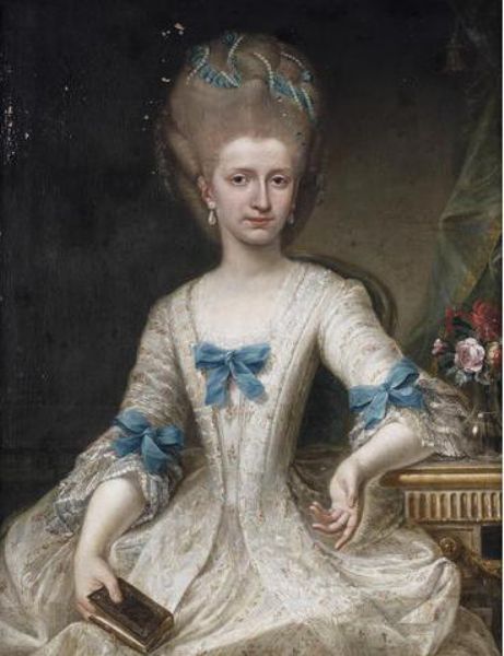 | Portrait of a lady, half-length, in a white dress decorated with blue ribbons, seated, holding a book | |