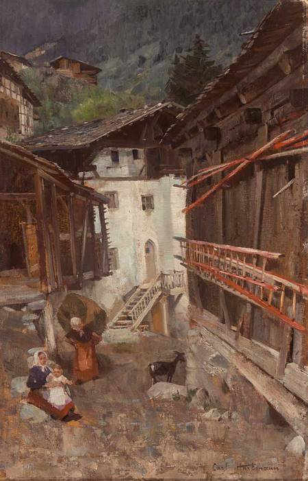 | Hochgebirgsdorf with picturesque houses in the hazy light. Staffage with two farmers and toddler | |