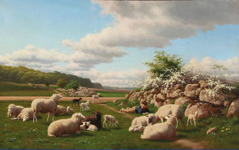 | Springday with a reading shepherd and sheeps around him, Kirke Hvalsø. | |