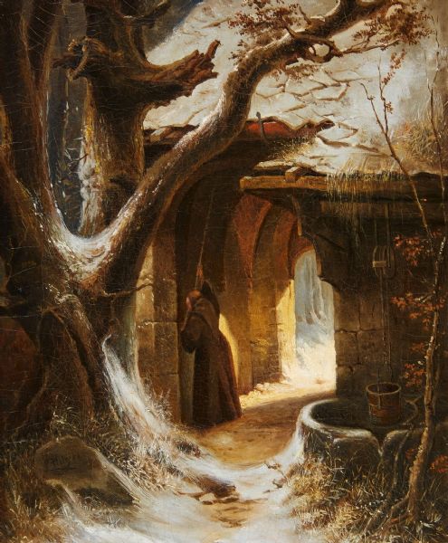 A Cloister in Winter with a Monk Ringing the Alms Bell