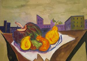 Still life of fruit and a melon with an industrial landscape beyond