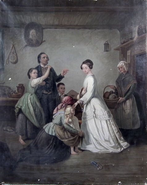 Interior cottage scene with figures