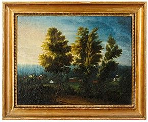 naivistiskt landskap med herrgårdsbyggnader