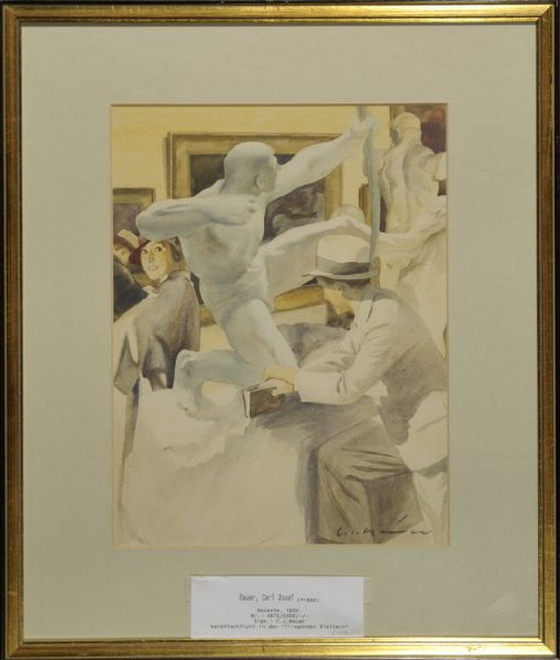 Im Museum betrachtet ein Paar die Skulptur eines Bogenschützen