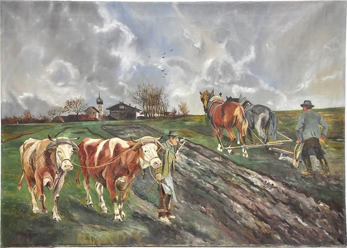 Zwei Bauern mit Pferde- und Kuhgespann bei der Feldarbeit