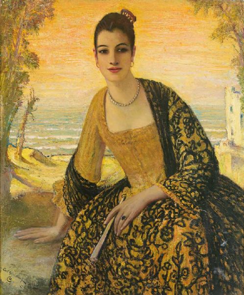 Portrait einer Spanierin vor Landschaftshintergrund