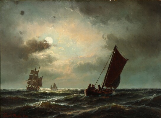 | Moonlit seascape with a two masteded schooner and sailboats | |