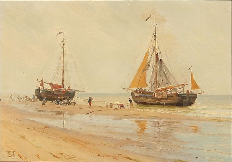 | Coastal scene with two sailing ships on the beach, presumably on Fanø Island. | |