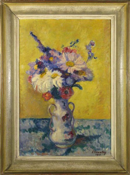 | Gartenblumenstrauß in Porzellanvase vor changierendem Hintergrund. Pastoser Farbauftrag in impressionistischer Manier | |