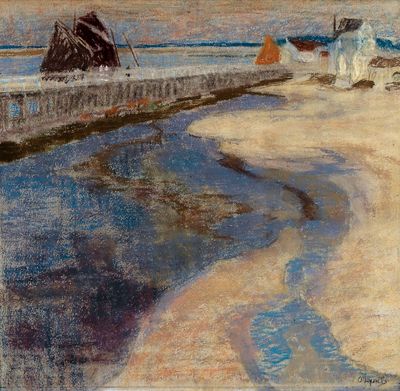 | Sailing boats on the mole; Dune landscape with a lighthouse; Houses | |