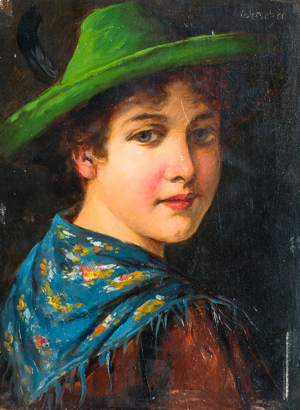 Dirndl mit grünem Filzhut und blau gemustertem Tuch