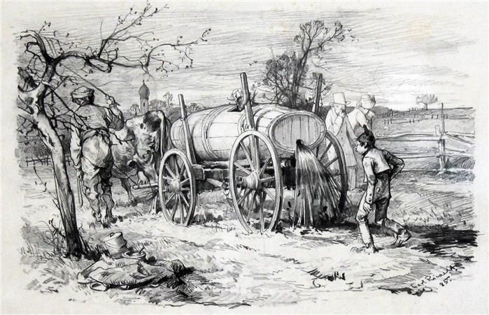 Humoristische Darstellung: Bauern beim Ausbringen der Jauche