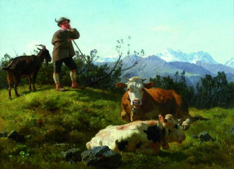 HIRTE MIT KÜHEN IN EINER GEBIRGSLANDSCHAFT.