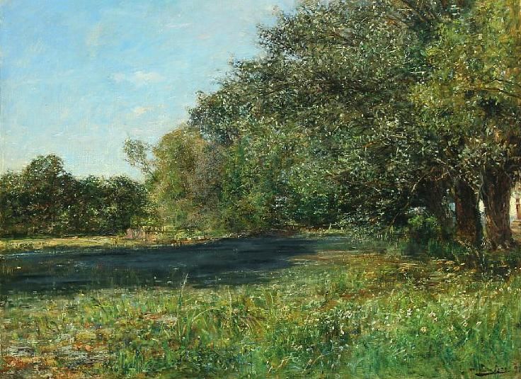 Summer landscape with trees at a lake.