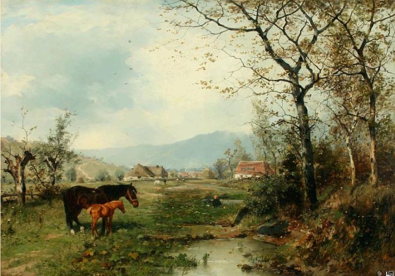 Autumn landscape with horses near a village