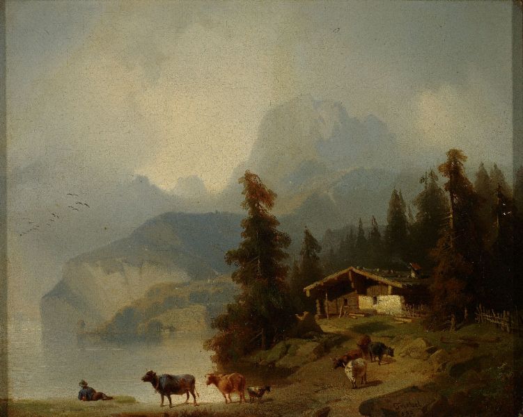 Gebirgslandschaft in den Alpen mit See, Gehöft und Tieren auf dem Weg zur Weide.