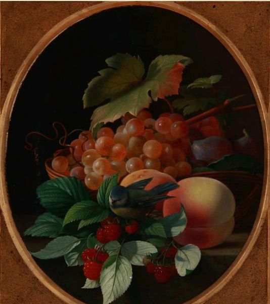 | Grapes, raspberries, figs and peaches on a sill with a blue tit sitting on a beech leaf | |