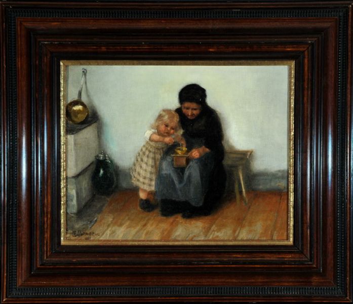 Frau mit Mädchen beim Kaffee mahlen in der Küche