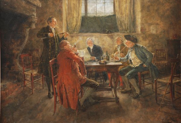 Figures conversing at the inn