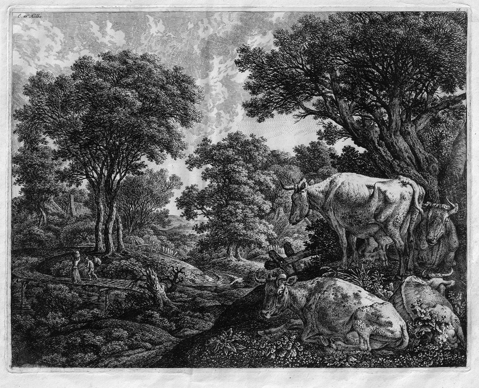 | Landschaft mit drei liegenden und einer stehenden Kuh | |