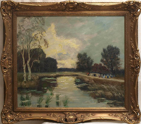 Nächtliche, norddeutsche Landschaft. Im Vordergrund ein einsames, reetgedecktes Haus an einem schilfgesäumten Weiher