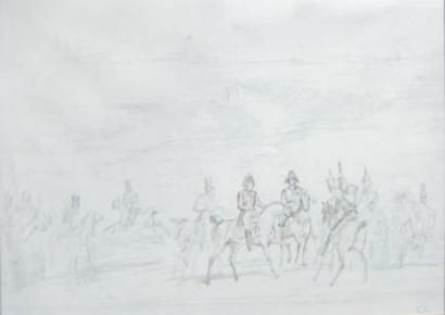 Officiers à cheval sur le champ de bataille